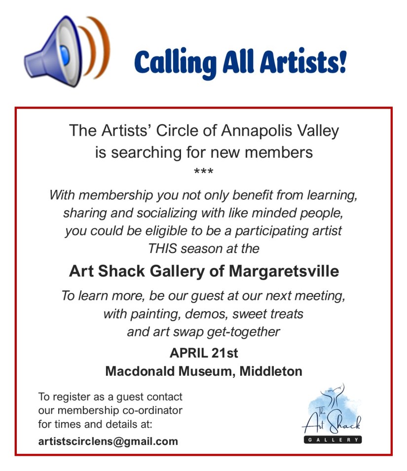Welcome to the Artists’ Circle EVENTS Join us for our monthly meeting, workshops and social gatherings. Always lots going on in The Circle. Find out more here… MEMBERSHIP Want to join us? If you live in the Annapolis Valley of Nova Scotia, it’s easy to become a member. Find out more here… Click here to learn more aboutThe Artists’ Circle The Art Shack Gallery Share this: Share on X (Opens in new window) X Share on Facebook (Opens in new window) Facebook